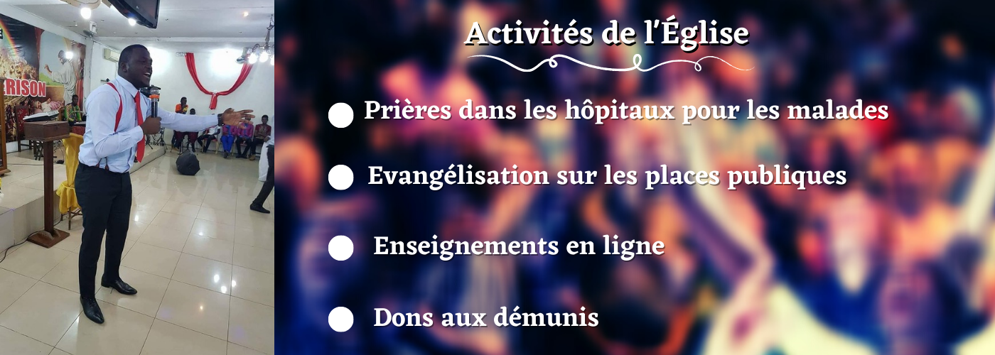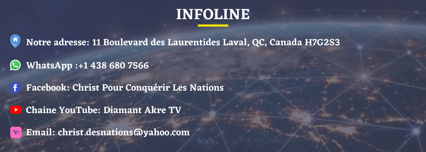 "Fondé an 2010, en Cote d’Ivoire, Le Ministère Christ Pour Conquérir Les Nations (CCNA) a reçu de la part du Seigneur JESUS CHRIST une mission, qui est de conquérir les âmes par la prière exaucée, la démonstration de la puissance de l’Esprit, la prédication, et la révélation de la Bonne Nouvelle qui est l’Evangile du Christ pour le salut des âmes dont parle Marc 16 :15..." Lire la suite